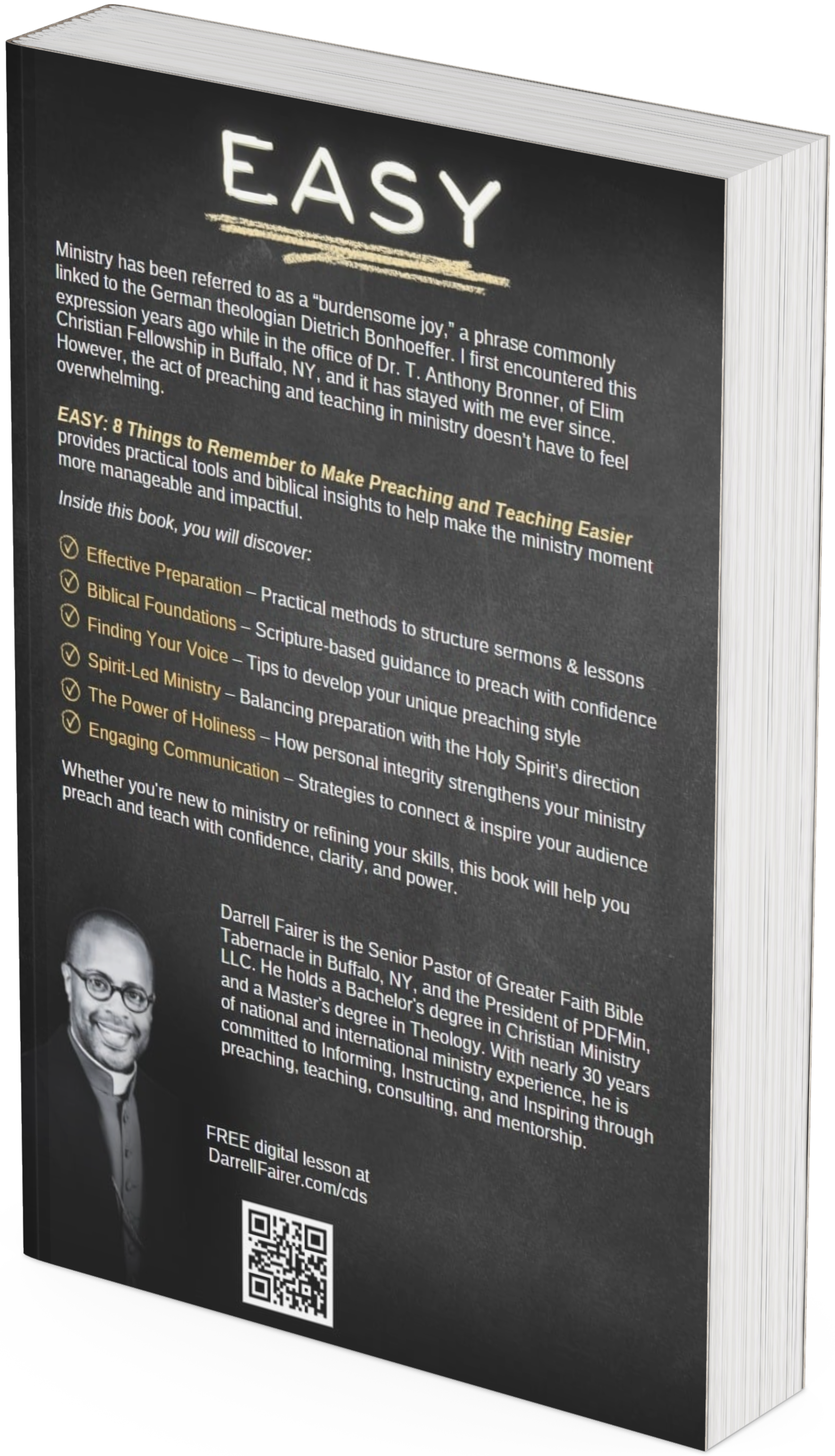 Drawing from nearly 30 years of ministry experience, Suffragan Bishop Darrell Fairer shares practical strategies to simplify the preaching and teaching process—without compromising depth, power, or biblical integrity. Whether you're a seasoned minister or just starting out, this book will help you refine your delivery, develop your authentic voice, and navigate the challenges of sermon preparation.